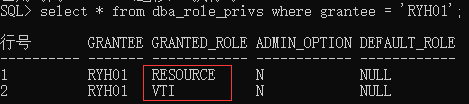 原本ryh01用户有vit,resource两个角色,执行回收语句后回收vti以后系只剩下resource角色。