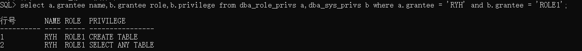 select a.grantee name,b.grantee role,b.privilege from dba_role_privs a,dba_sys_privs b where a.grantee = 'RYH' and b.grantee = 'ROLE1';可以查到ryh用户赋予了role1角色拥有对应的两个系统权限。