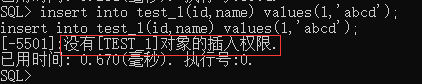 如图所示报没有test_1对象插入权限。因为ryh用户赋予的是role1角色,而role1角色没有插入权限因此报错。