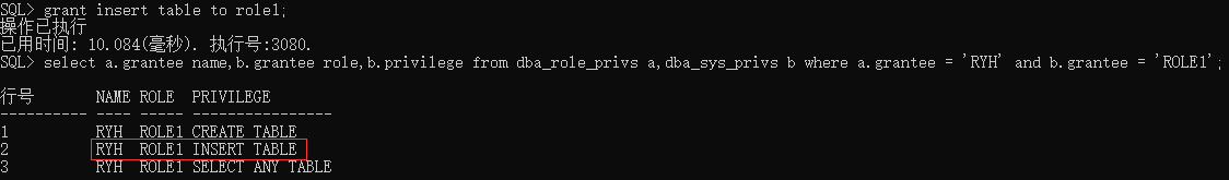 select a.grantee name,b.grantee role,b.privilege from dba_role_privs a,dba_sys_privs b where a.grantee = 'RYH' and b.grantee = 'ROLE1';可以查到ryh用户赋予了role1角色,而role1新增了insert table系统权限。