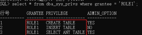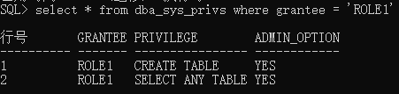 select * from dba_sys_privs where grantee = 'ROLE1';可以查到刚赋予的系统权限create table