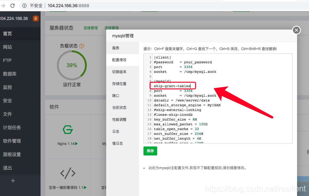 可以到宝塔面板mysql配置上添加