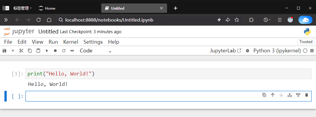 在虚拟环境中,用“cd”命令进入到工作目录,输入“jupyter notebook”命令在浏览器中启动Jupyter Notebook,工作目录初始为空目录,点击右上角的new按钮,选择其中的“Python3”建立一个新的代码文件。在新打开的窗口的第一行输入print(“Hello, World!”)语句,然后点击工具栏中的Run按钮或者输入Shift+Enter快捷键使程序运行,会在该行下面输出“Hello, World!”,如下图所示。点击File菜单,选择其中的“Rename…”项,可以将保存在工作目录下的文件更名为“hello.ipynb”。可见在Jupyter方式里,也可以进行交互式编程,还可以保存运行过程供以后再次察看。