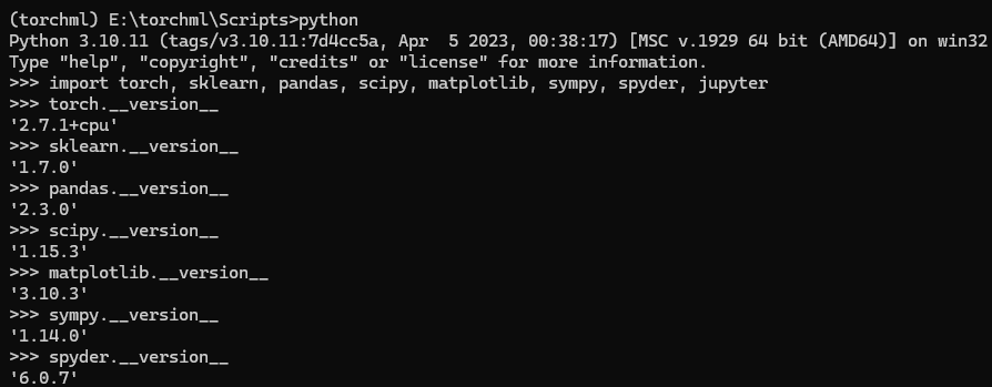 同样方法安装jupyter,matplotlib,spyder,hmmlearn,pandas,torchvision,torchinfo,statsmodels等,并验证是否安装成功,如上图所示。