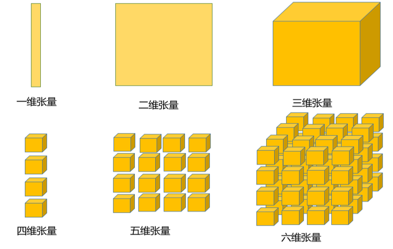 张量是多维排列的数据。不同维度的张量分别表示不同的数据,0维张量表示标量,1维张量表示向量,2维张量表示矩阵,3维张量可以表示彩色图像的RGB三通道等等,如下图所示。