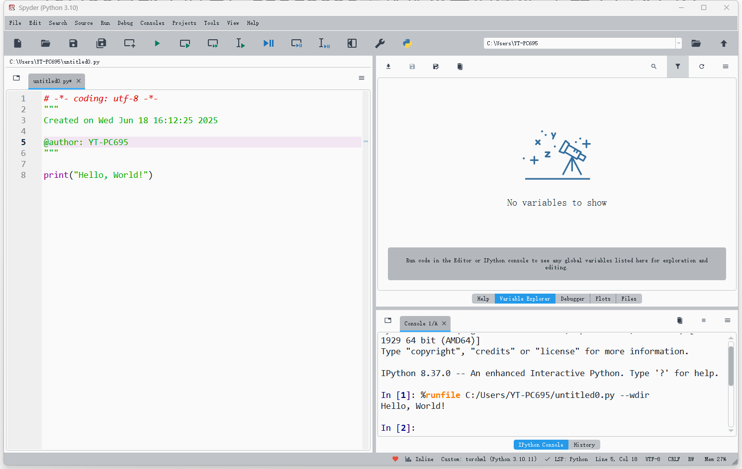 Spyder是图形化集成开发环境,按上小节的方法启动虚拟环境后,输入“spyder”命令启动Spyder,如下图所示。启动之后,默认会打开一个名为:untitled0.py的临时代码文件。在其中新的一行输入print(“Hello, World!”)语句,点击工具栏中的绿色右三角运行,将在右下的输出窗口中输出“Hello, World!”。