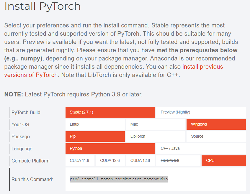 到PyTorch官网(https://pytorch.org/)的安装页面,按设备条件生成相应的安装命令,如下图中最下面一行“pip3 install torch torchvision torchaudio”所示。