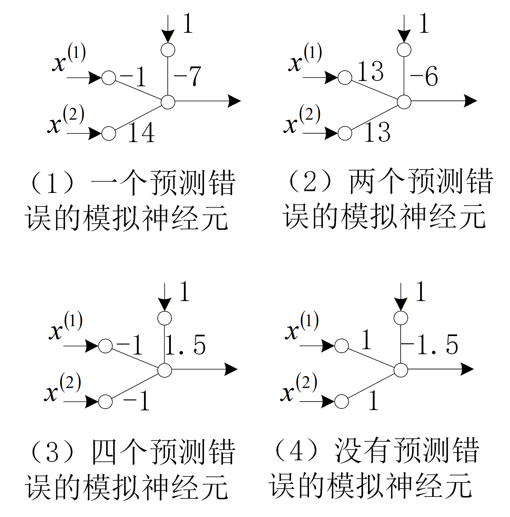 上面通过模拟逻辑运算来说明了神经网络的非线性处理能力,这里仍然利用它来说明损失函数的概念。下图给出了四个用来模拟与运算的M-P神经元,它们分别会出现0个或多个错误,例如,对第1个神经元来说,当输入0,1时,会输出错误的1;对第2个神经元来说,当输入0,1和1,0时,都会输出错误的1。