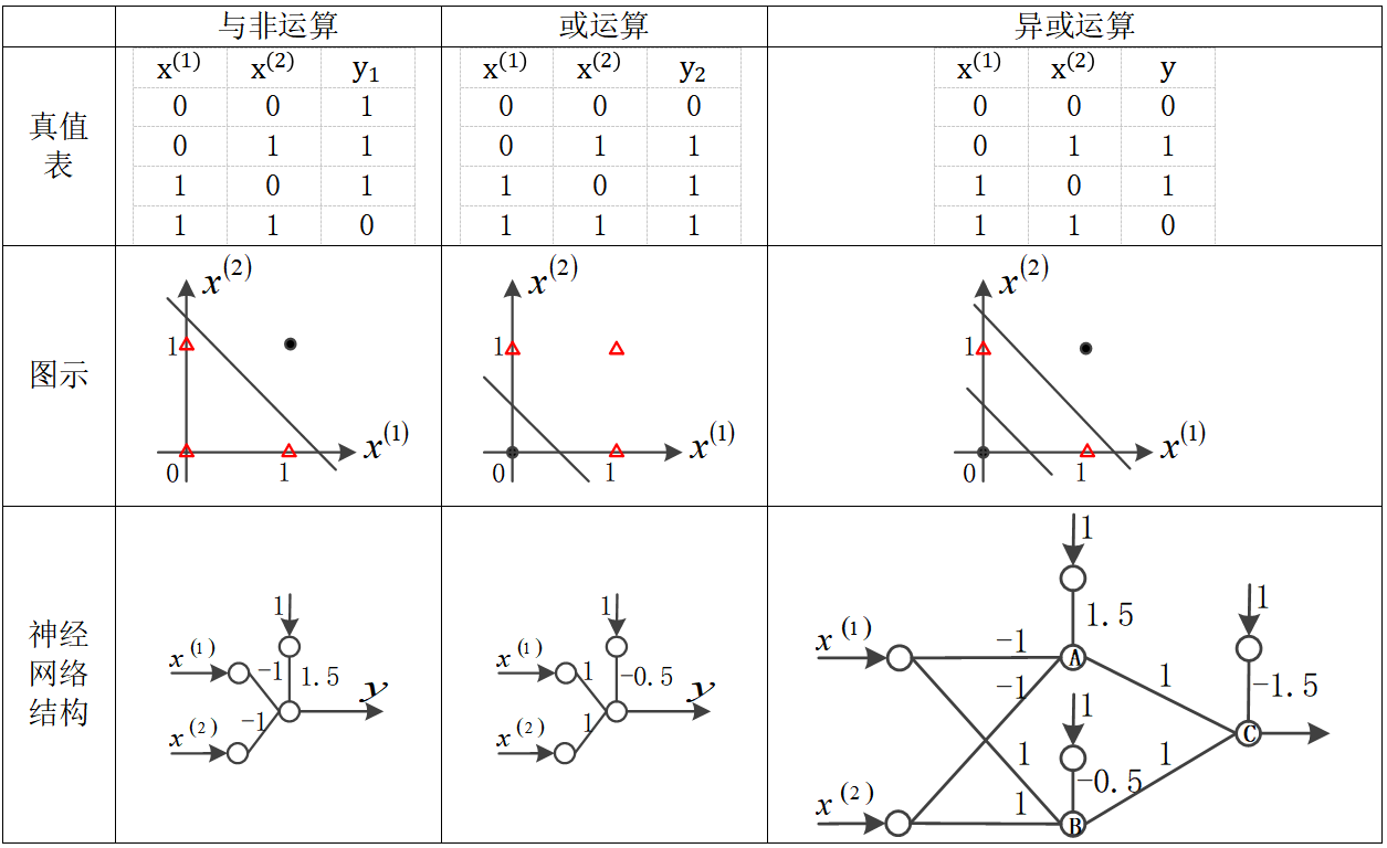 异或运算的真值表、图示如下图最右栏所示,显然它是线性不可分的,因此无法用一个神经元来模拟。此时,可以用三个分别模拟与非运算、或运算和与运算的神经元相互连接起来实现模拟,如下图最右栏最下格所示,其中神经元A模拟了与非运算,神经元B模拟了或运算,神经元C模拟了与运算。神经元A和B都接收输入和