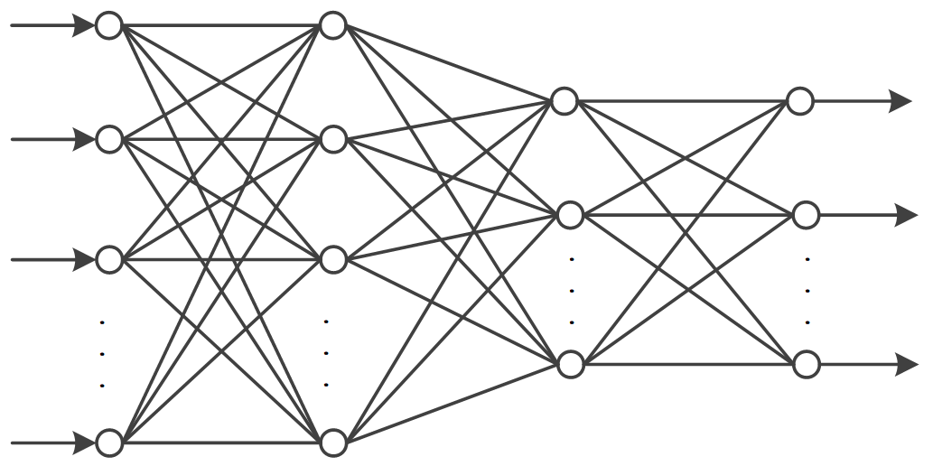 理论上,可以通过将神经元的输出连接到另外神经元的输入而形成任意结构的神经网络。目前,复杂神经网络的结构设计还没有完全有效的理论指导,不同结构的神经网络在功用方面的差别还没有完备的理论可以用来进行分析。当前,复杂神经网络的结构设计,主要还是靠经验指导和试验摸索。目前,人们摸索较多且得到广泛应用的是所谓层状结构的神经网络,如下图所示。