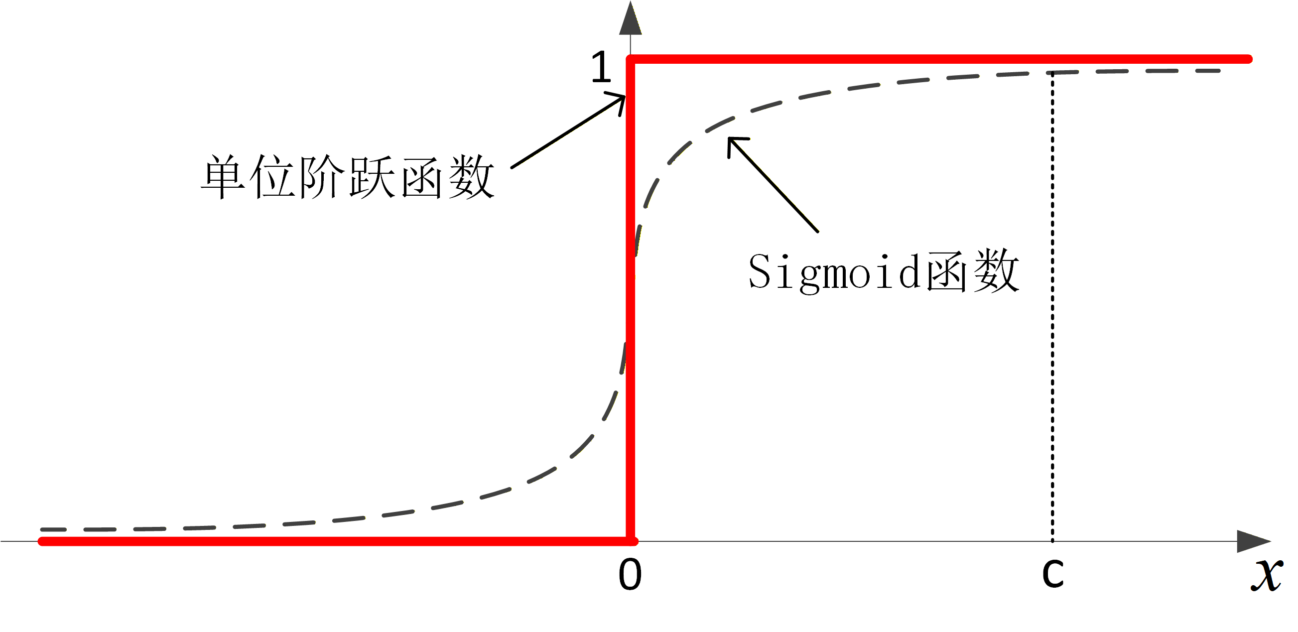 单位阶跃函数不连续,在优化计算时难以处理,于是,常用近似的函数来代替它,例如上图中虚线所示的Sigmoid函数: