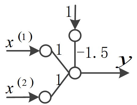 它是将一个两输入的神经元的连接系数都设为1,将阈值系数设为-1.5,将该神经元画出来如下图所示。
