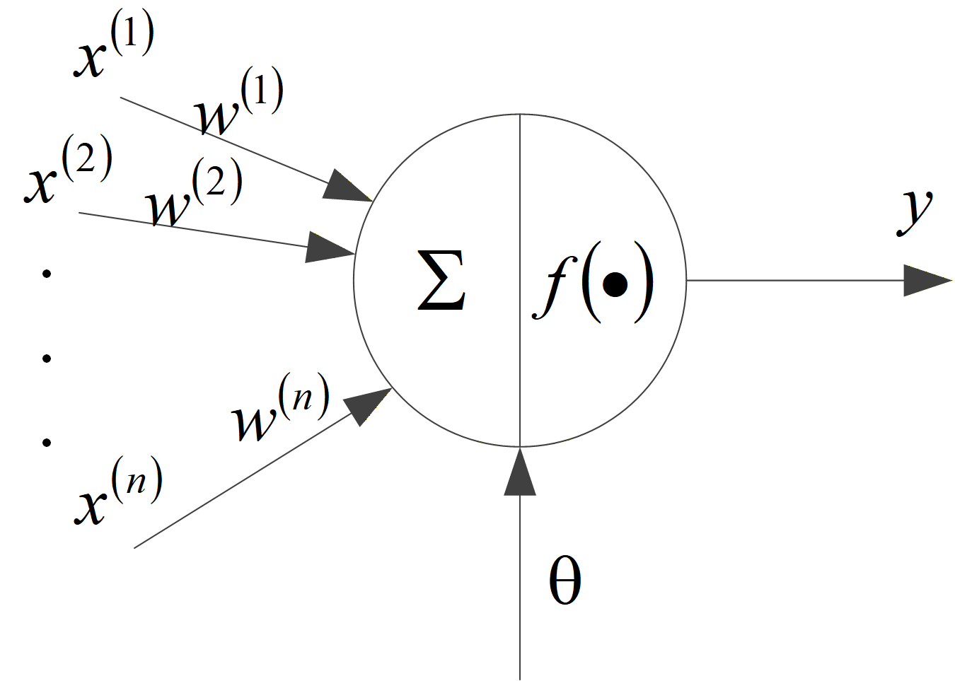 表示输入信息对应的连接系数值。Σ 表示对输入信息进行加权求和。θ 是一个阈值,模拟生物神经元的兴奋“限度”。输入信息经过加权求和后,与阈值进行比较,该信息处理过程是一个对输入信息的线性组合过程: