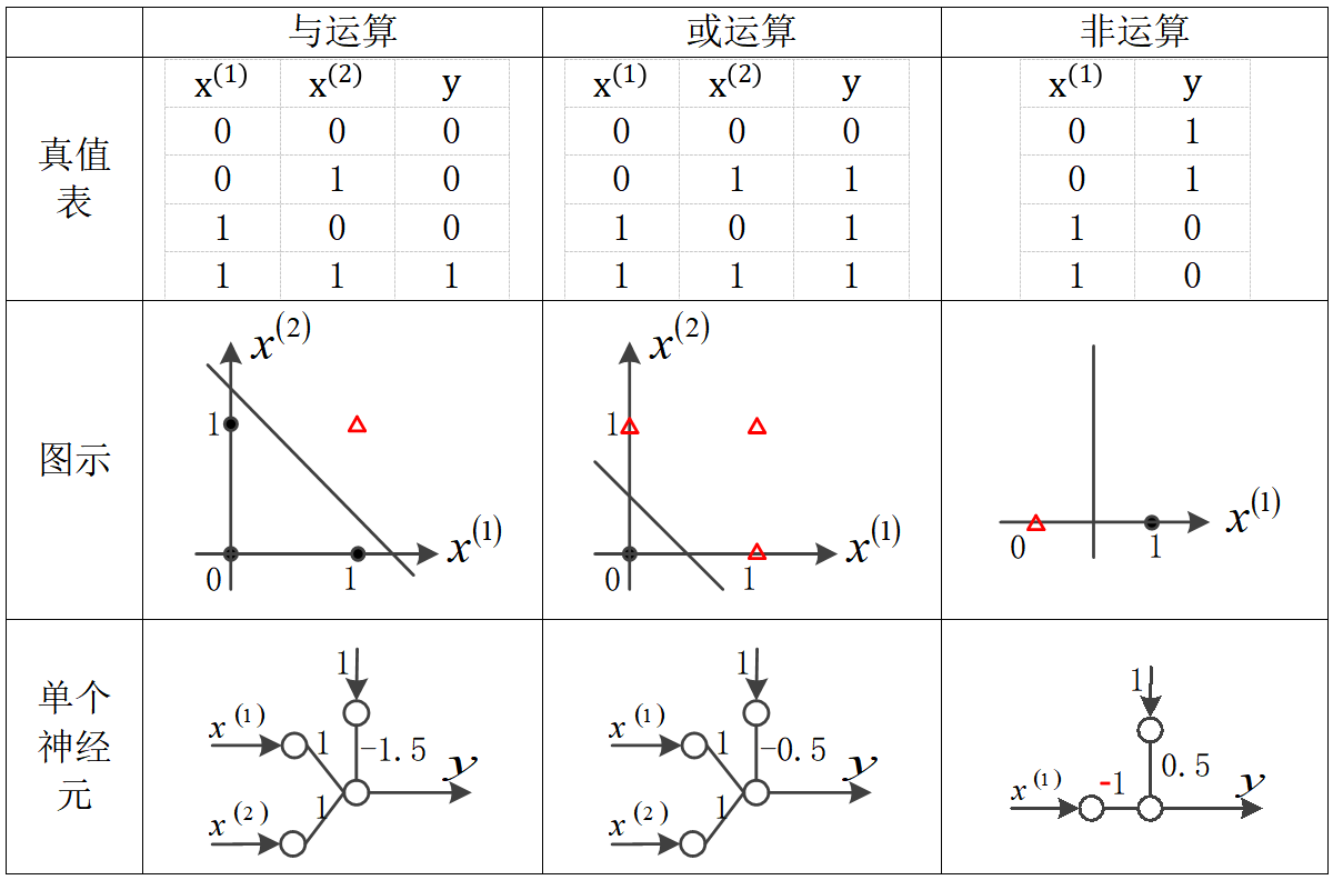 实际上,逻辑代数的与、或、非三个基本运算都是线性可分的,因此都可以用神经元来模拟,如下图所示。