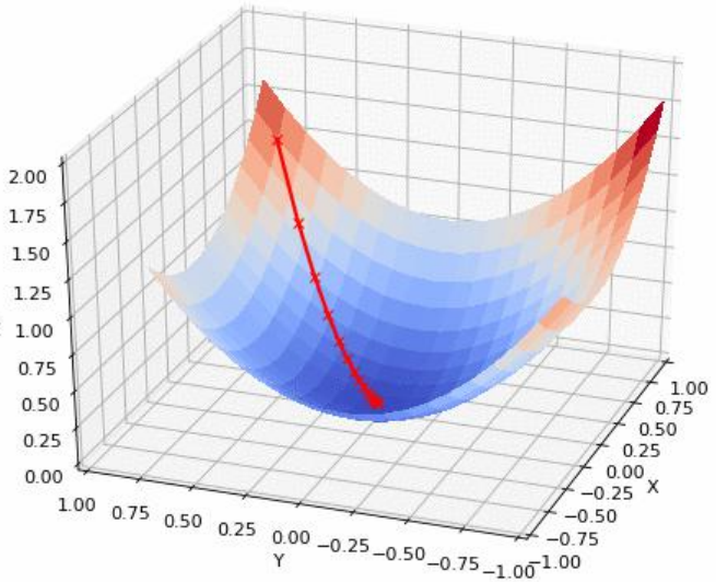 是该函数增长最快的方向。二元变量函数沿梯度反方向下降的迭代过程可以在三维空间中形象显示出来,如下图[1]所示。从初始点出发,沿下降最快的方向前进,直到极低点。
