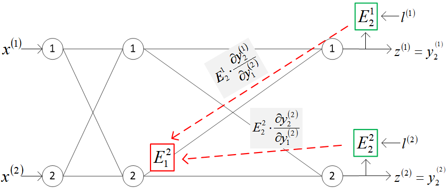 沿求导路径反向传播到第1隐层节点2的校对误差,如下图所示。