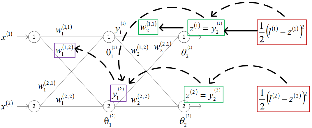 假设该神经网络的各项参数初始都是随机设置的,本节示例如何通过误差反向传播学习算法来调整它们。