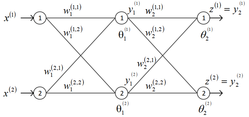 ,它们要输入第1隐层的两个神经元,根据神经元模型(参见本专栏第三篇文章),可计算得到第1隐层两个神经元的输出: