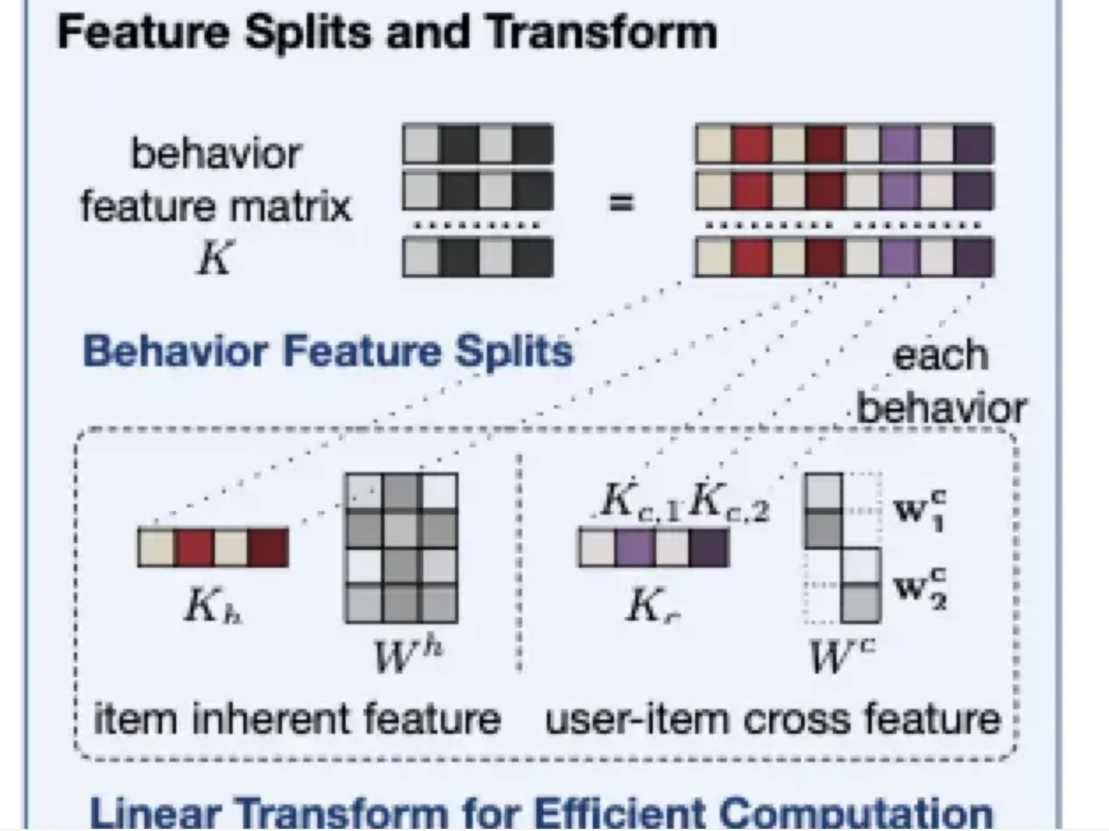 2)K的计算如果包含一些用户相关的特征如user-item的交叉特征等,是不能减少其线上推理计算量的,但如果特征中全是item自身的特征,不包含用户以及上下文信息,那么这块是可以提前计算并进行存储的,线上直接抽取即可。从这个角度出发,论文提出了特征拆分的思路。