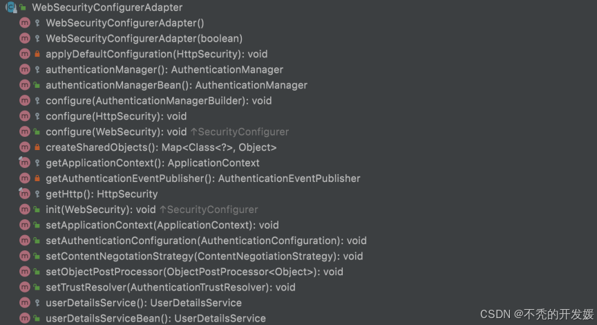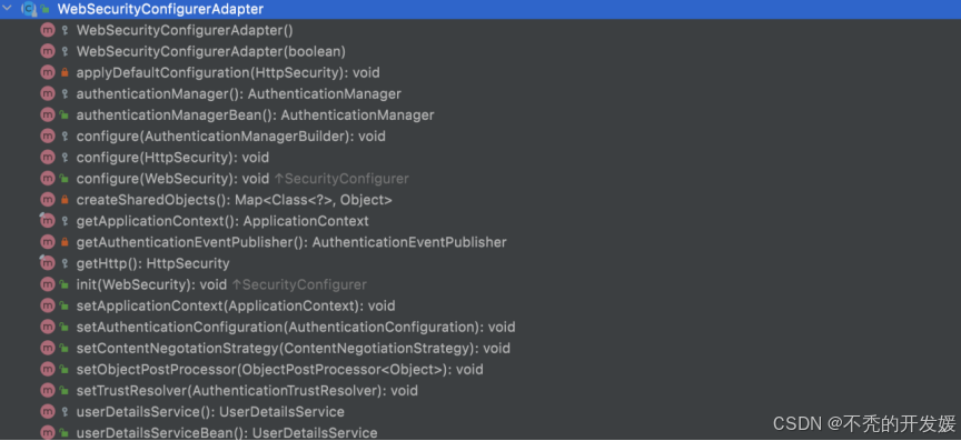 如果要对 Spring Security 进行自定义配置,就要自定义这个类实例,通过覆盖类中方法达到修改默认配置的目的。