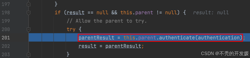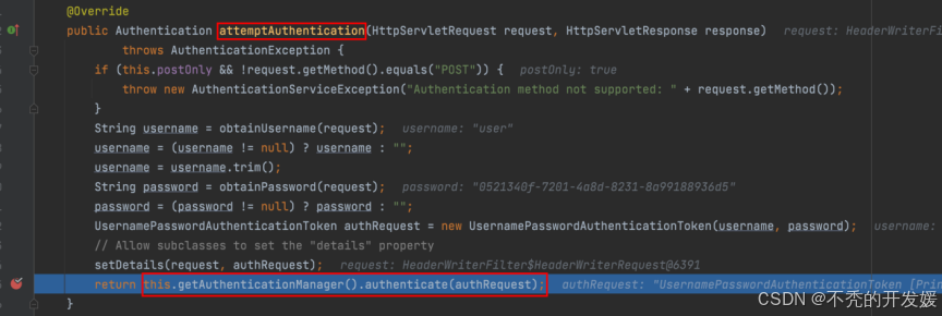 查看类中 UsernamePasswordAuthenticationFilter#attempAuthentication 方法得知实际调用 AuthenticationManager 中 authenticate 方法