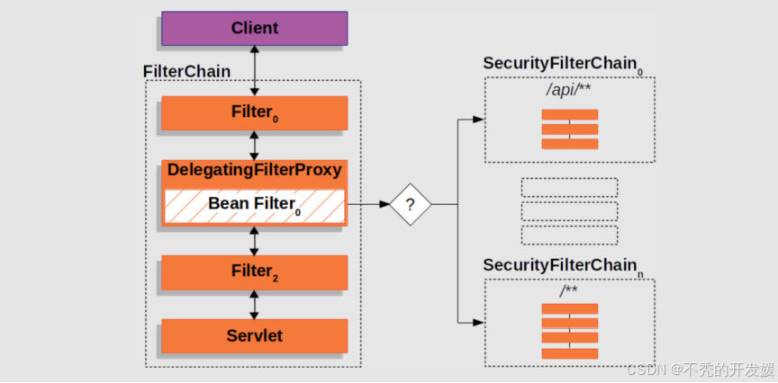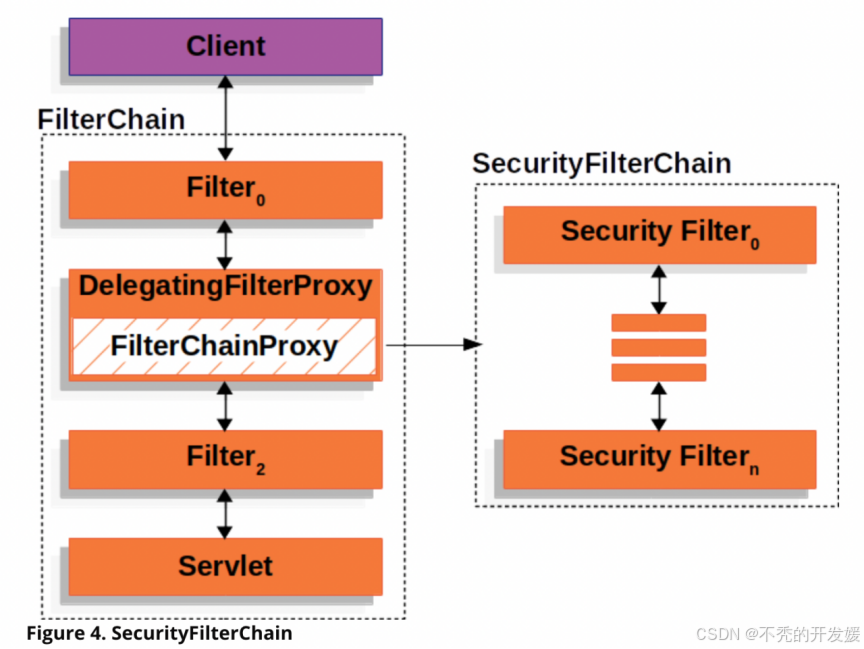 FlterChainProxy 来统一管理。Spring Security 中的过滤器链通过 FilterChainProxy 嵌入到 Web项目的原生过滤器链中。FilterChainProxy 作为一个顶层的管理者,将统一管理 Security Filter。FilterChainProxy 本身是通过 Spring 框架提供的 DelegatingFilterProxy 整合到原生的过滤器链中。