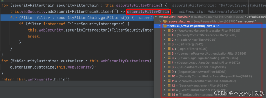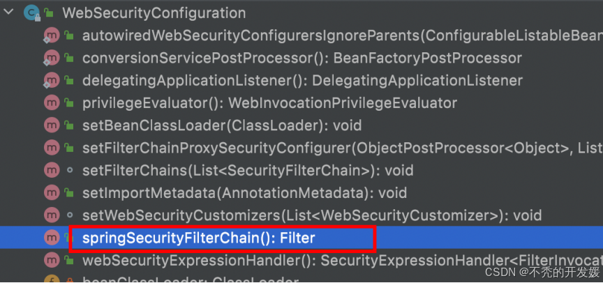 可以看出,Spring Security 提供了 30 多个过滤器。默认情况下Spring Boot 在对 Spring Security 进入自动化配置时,会创建一个名为 SpringSecurityFilerChain 的过滤器,并注入到 Spring 容器中,这个过滤器将负责所有的安全管理,包括用户认证、授权、重定向到登录页面等。具体可以参考WebSecurityConfiguration的源码: