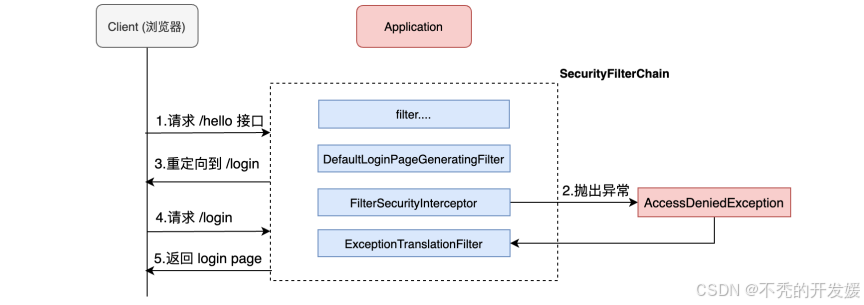 - 抛出 AccessDeniedException 的异常会被 ExceptionTranslationFilter 捕获,这个 Filter 中会调用 LoginUrlAuthenticationEntryPoint#commence 方法给客户端返回 302,要求客户端进行重定向到 /login 页面。