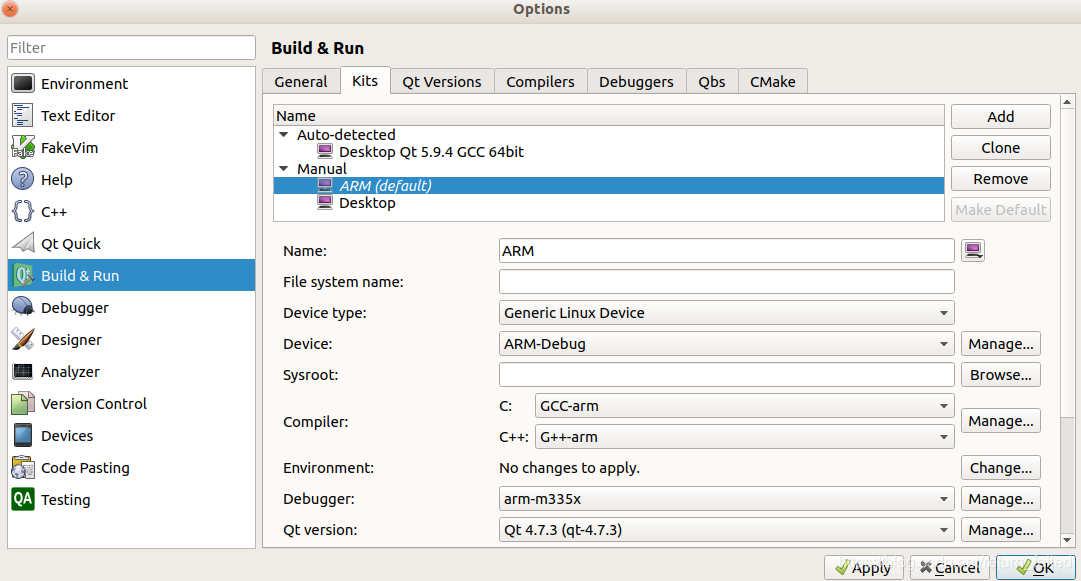 选择Build&Run->Kits,Add新建一个目标平台。Name处填入名称,这里是ARM。Device处选择2.1中配置的设备,Debugger处选择2.2中配置的调试器。另外,Compiler 和 Qt version 需选择对应的交叉编译环境,这里不做介绍。