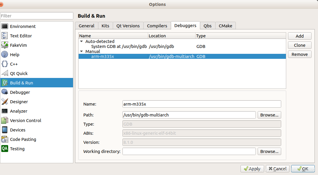 选择Build&Run->Debuggers进入如下界面。选择”Add”新建一个,名称自取,这里是“arm-m335x”,path路径处选择1中gdb-multiarch安装路径,通常为/usr/bin/gdb-multiarch。选择OK保存。