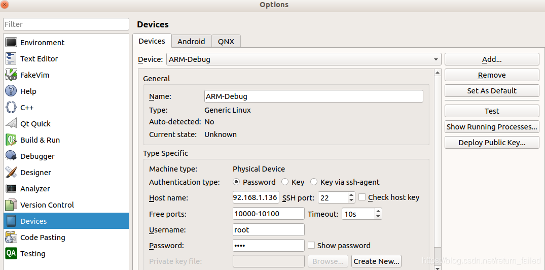 选择/Tools->Option进入如下界面,选择Device。这里我用的是ssh登录。