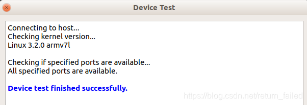 Add添加设备,在Name处填入设备名称,这里是”ARM-Debug”,Host name处填入设备的ip地址,SSH port处填入ssh端口号,username和password处填入设备的登录名和登录密码。如果设备已上电与PC连接好可点击Test测试。如果连接成功可弹出如下界面,如果连接失败,可以PC先通过ssh登录arm板再进行测试。