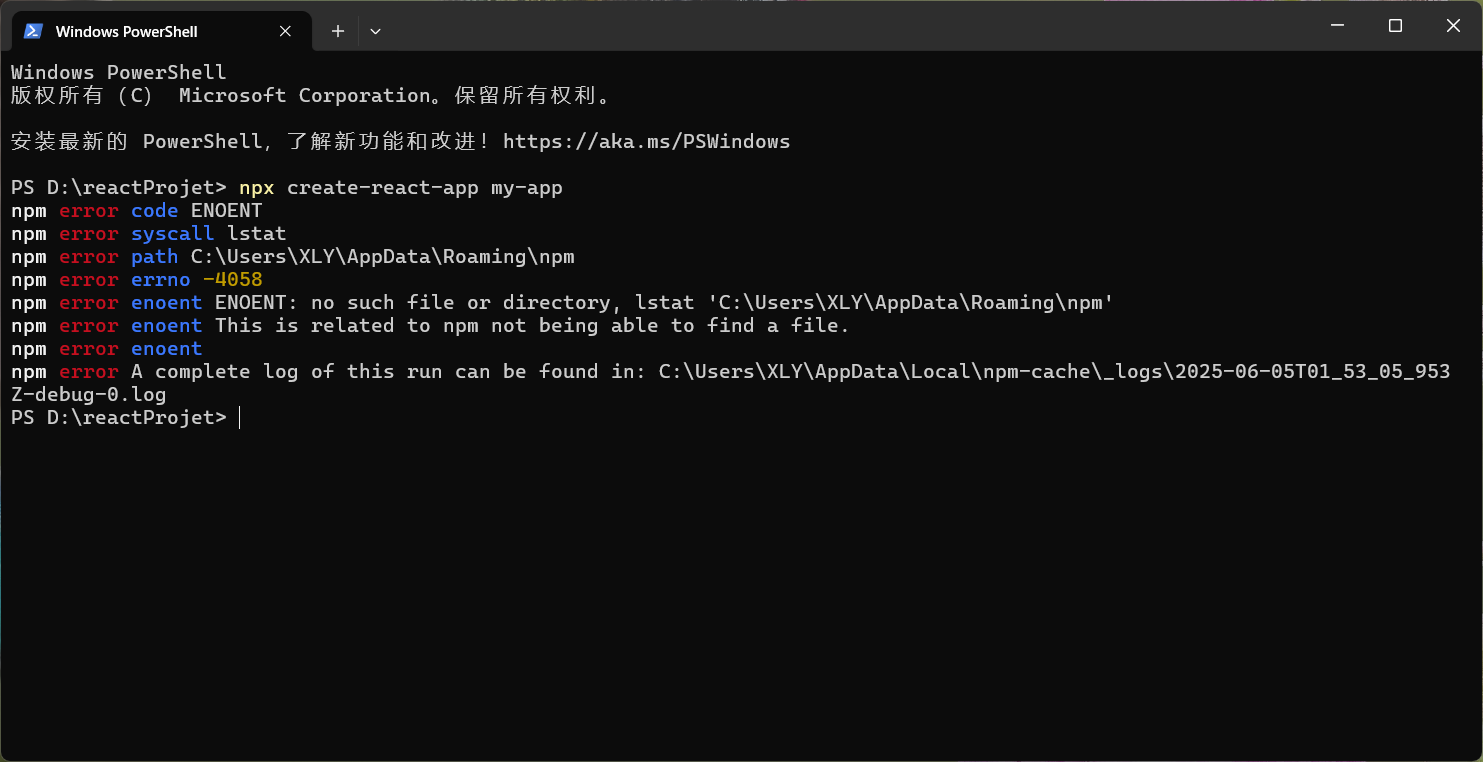 根据react文档上安装命令行npx create-react-app my-app,但是出现报错信息。信息如下: