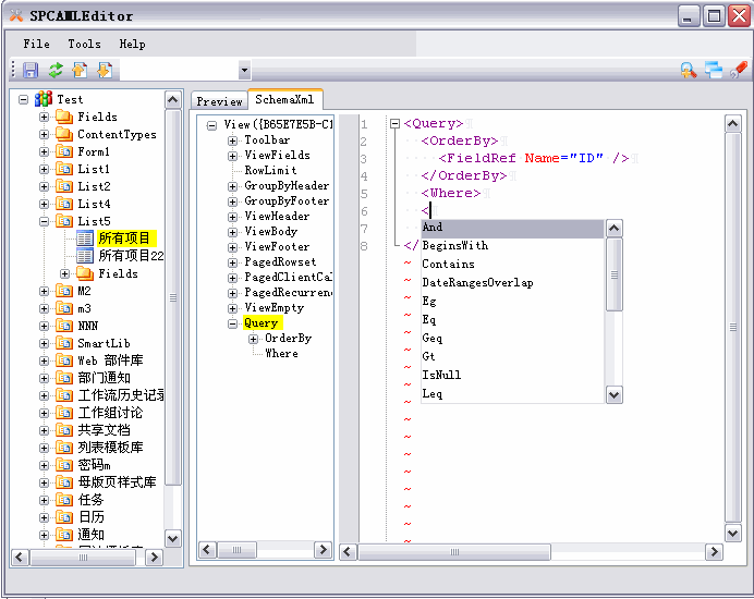 3)可以利用它的智能提示功能来写Caml查询。