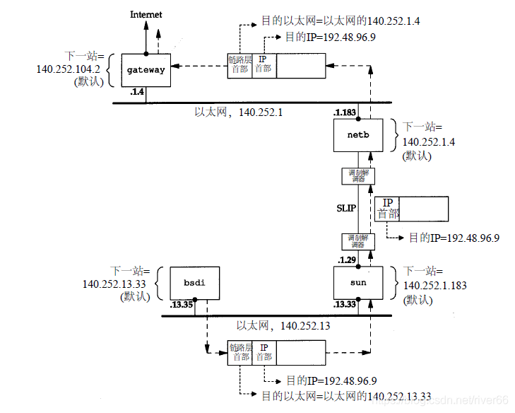 3、经过搜索路由表,选用了默认表目。根据sun的默认表目,它把数据报转发到下一站路由器netb,该路由器的地址是140.252.1.183。数据报是经过点对点SLIP链路被传送的。这里,我们没有给出像以太网链路层数据帧那样的首部,因为在SLIP链路中没有那样的首部。