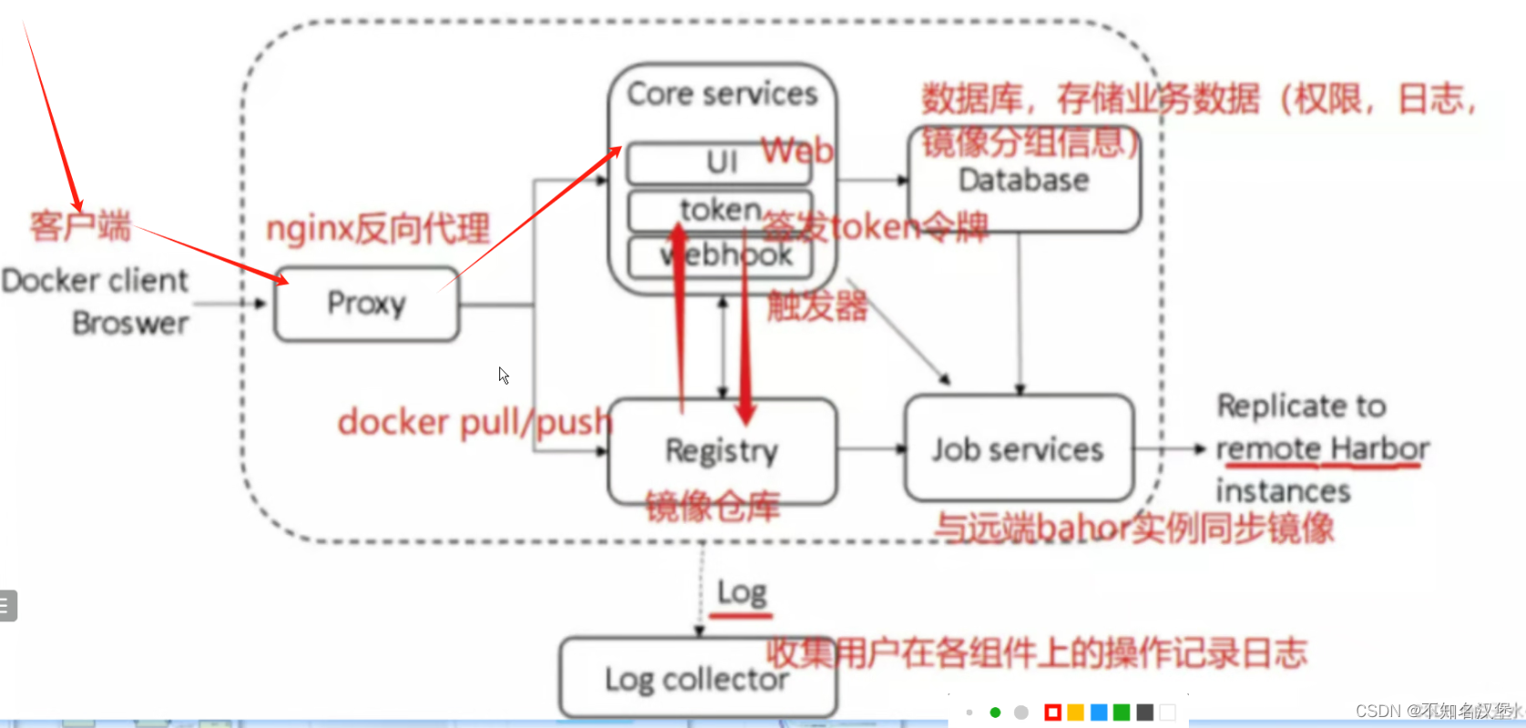 Harbor在架构上主要有proxy,registry,core services,database(Harbor-db),log collector(Harbor-log),job services六个组件。