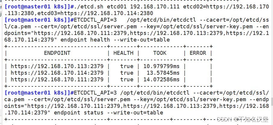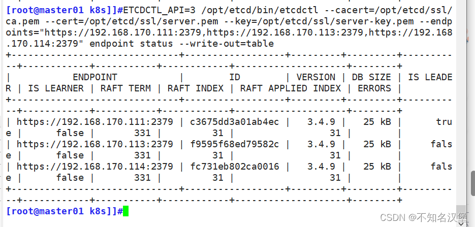 ETCDCTL_API=3 /opt/etcd/bin/etcdctl --cacert=/opt/etcd/ssl/ca.pem --cert=/opt/etcd/ssl/server.pem --key=/opt/etcd/ssl/server-key.pem --endpoints="https://192.168.170.111:2379,https://192.168.170.113:2379,https://192.168.170.114:2379" endpoint status --write-out=table