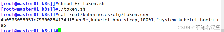 #创建 bootstrap token 认证文件,apiserver 启动时会调用,然后就相当于在集群内创建了一个这个用户,接下来就可以用 RBAC 给他授权,查看是否生成了csv文件