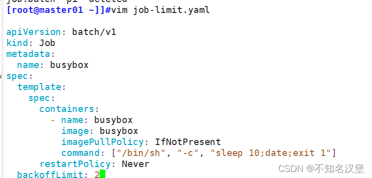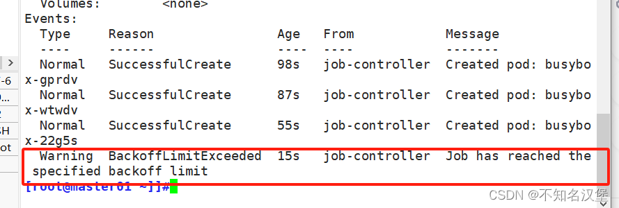 .spec.backoffLimit用于设置job失败后进行重试的次数,默认值为6。默认情况下,除非Pod失败或容器异常退出,Job任务将不间断的重试,此时Job遵循 .spec.backoffLimit上述说明。一旦.spec.backoffLimit达到,作业将被标记为失败。