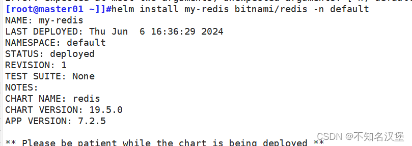 helm install my-redis bitnami/redis [-n default] #指定 release 的名字为 my-redis,-n 指定部署到 k8s 的 namespace