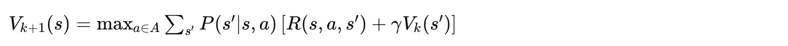 │ V_{k+1}(s) = max_a Σ_s' P(s'|s,a)[R + γV_k(s')] │