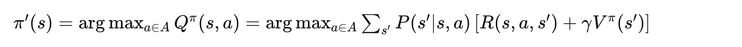 │ π'(s) = argmax_a Σ_s' P(s'|s,a)[R + γV(s')] │