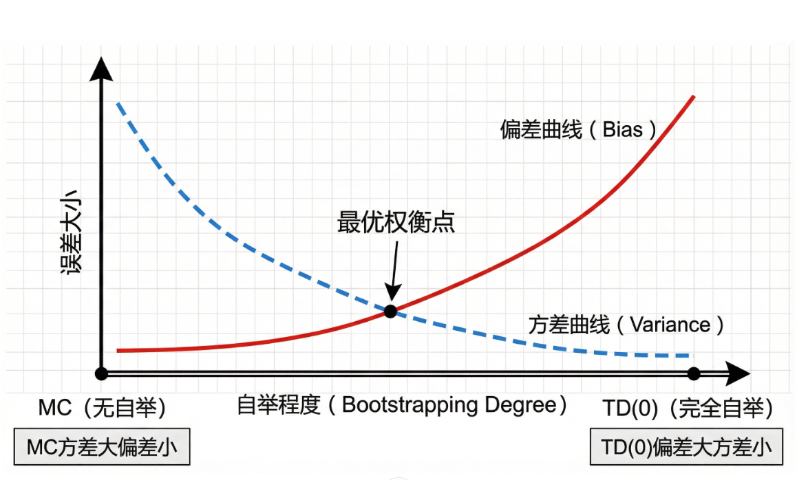 | 蒙特卡洛(MC) | 不需要环境模型,从经验中学习 | 必须等到回合结束才能更新 |