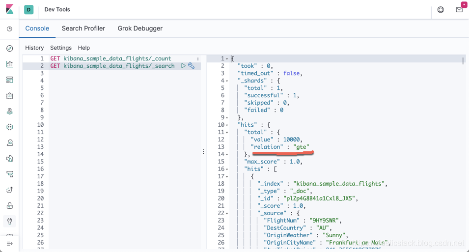 当文档的数值大于10000时,返回的 total 数值为10000,并在 relation 中指出 gte。