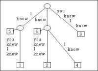 图中示意了字符串 "I know you know I know "的后缀树。内部节点用圆来表示,叶子用矩形来表示,该例子中有六个叶子,被标号为1到6。 终止字符在图中被省略掉了。