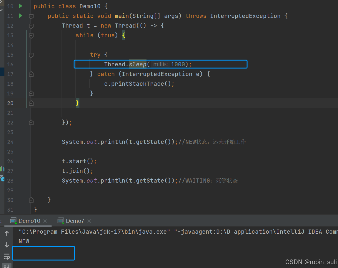 public static void main(String[] args) throws InterruptedException { Thread t = new Thread(() -> { while (true) { try { Thread.sleep(1000); } catch (InterruptedException e) { e.printStackTrace(); } } }); System.out.println(t.getState());//NEW状态:还未开始工作 t.start(); t.join(1000 * 10); System.out.println(t.getState());//TIMED_WAITING:阻塞状态 }