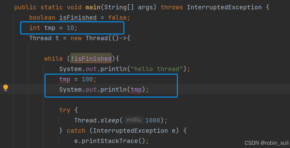 public class Demo5 { private static boolean isFinished = false;//通过一标志来结束线程 public static void main(String[] args) throws InterruptedException { Thread t = new Thread(()->{ while (!isFinished){ System.out.println("hello thread"); try { Thread.sleep(1000); } catch (InterruptedException e) { e.printStackTrace(); } } System.out.println("thread 结束"); }); t.start(); Thread.sleep(3000); isFinished = true; } }注意:lambda表达式不能把这个isFinished标志写在局部变量位置,因为变量捕获机制,拷贝了一份变量给lambda表达式,拷贝的值是不允许改变的,所以捕获的值不可改变,就会报错