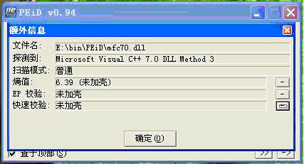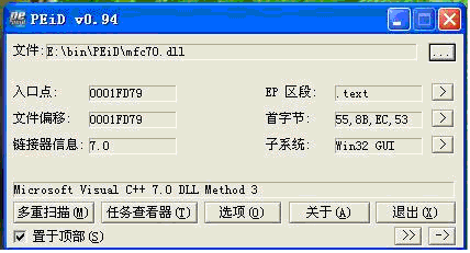 “多项扫描”上面那行“Microsoft Visual C++ 7.0 Dll Method 3”就是该程序的开发环境了。