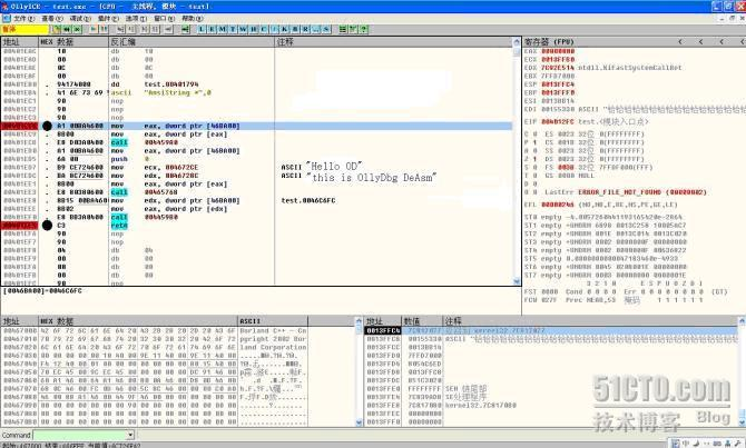 使用OD(OllyICE)打开test.exe程序,如示意图6: